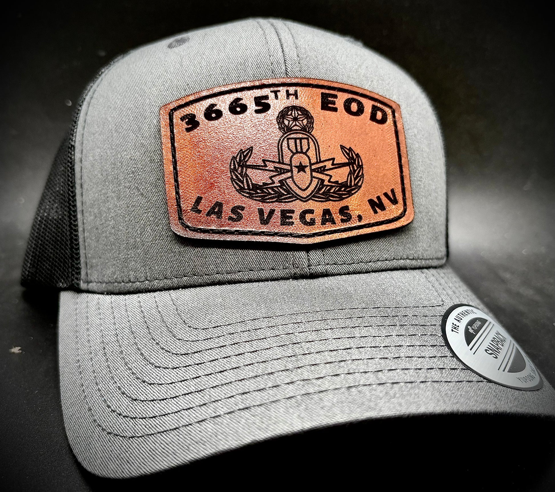 Hand Sewn 3665th EOD Leather Patch Hat. Patches are sewn with bonded nylon thread onto Richardson or Yupoong caps depending on color and availability. Patches are designed, cut, engraved, and sewn locally in Moore County, NC by an Active Duty Owned and Operated Business.