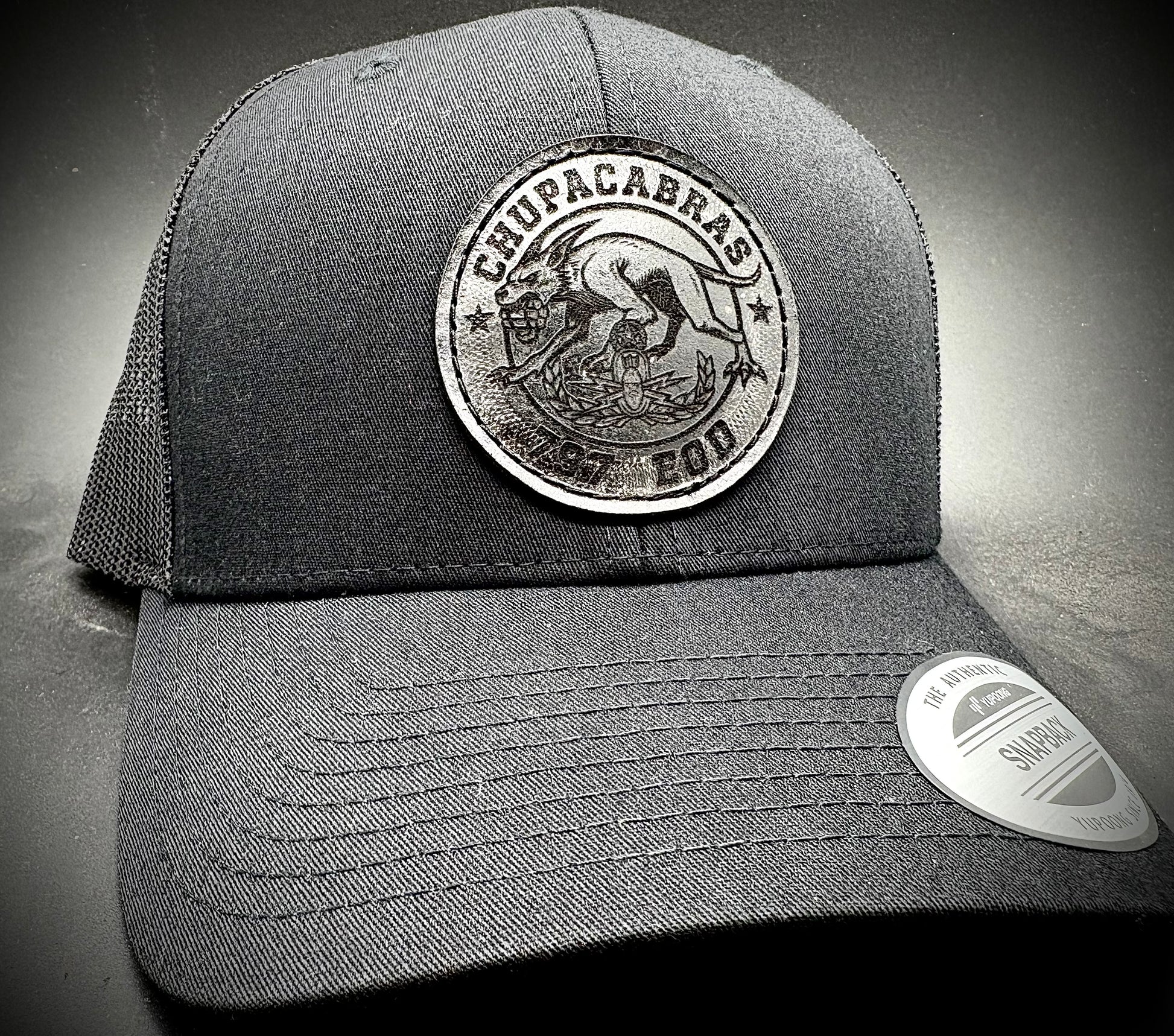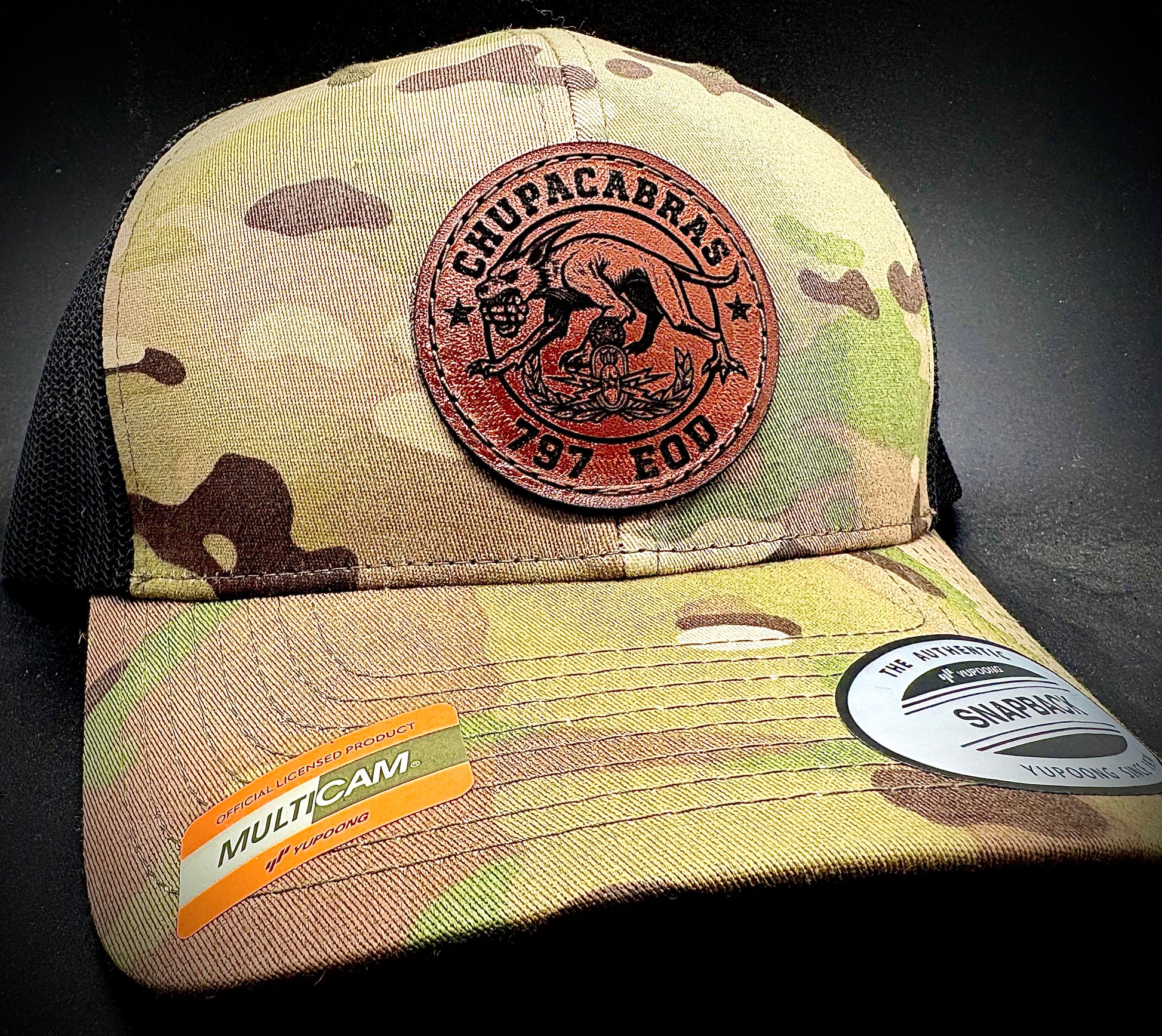 Hand Sewn 797th EOD “Chupacabras" Leather Patch Hat. Patches are sewn with bonded nylon thread onto Richardson or Yupoong caps depending on color and availability. Patches are designed, cut, engraved, and sewn locally in Moore County, NC by an Active Duty Owned and Operated Business.