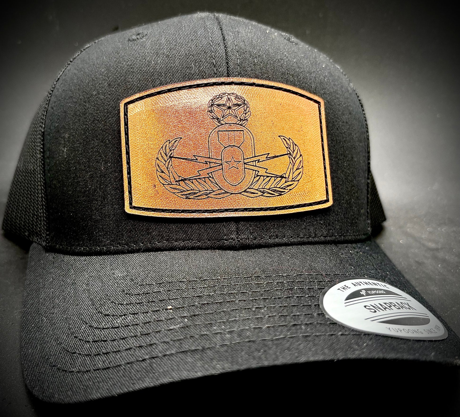 Hand Sewn Vintage Series Basic, Senior, and Master EOD Badge Leather Patch Hat. Patches are 2.25" x 3.25" and are sewn with bonded nylon thread onto Richardson or Yupoong caps depending on color and availability. Patches are designed, cut, engraved, and sewn locally in Moore County, NC by an Active Duty Owned and Operated Business.